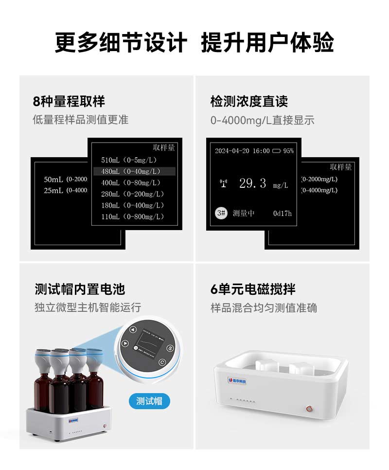 值得一提的是,LH-BOD306的每個測試帽都相當于一個微型主機,內(nèi)置CR-P2電池和1.5吋OLED屏幕,可獨立運行并查看檢測數(shù)據(jù)、數(shù)據(jù)曲線圖等信息。這一創(chuàng)新設(shè)計使得即使在主機短暫停電的情況下,測試也不會受到影響,確保了數(shù)據(jù)的連續(xù)性和完整性。