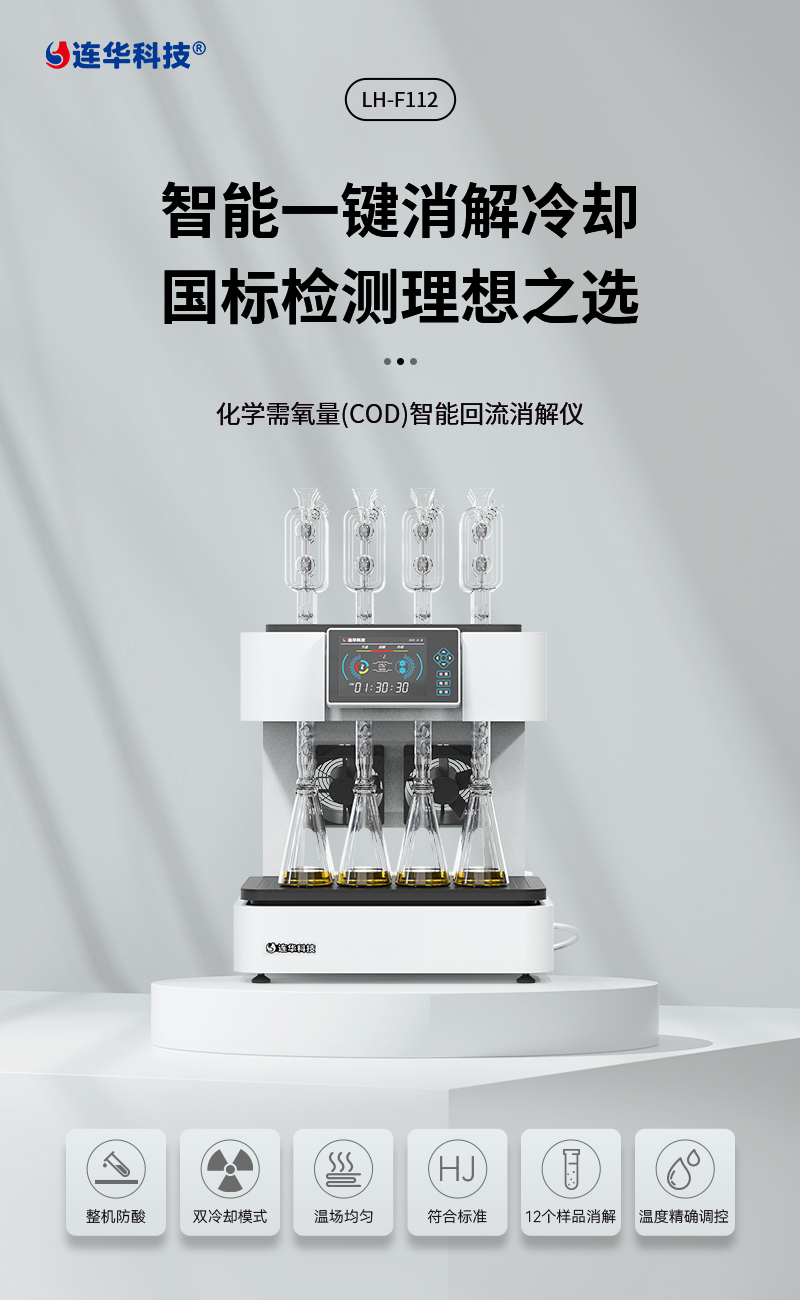 化學需氧量(COD)智能回流消解儀LH-F112  該儀器依據國家新標準《HJ828-2017  水質化學需氧量的測定重鉻酸鹽法》設計制造,同時兼顧原國標,適用于各種生活用水和工業廢水的檢測,儀器內置回流系統,可智能定時,操作簡單
