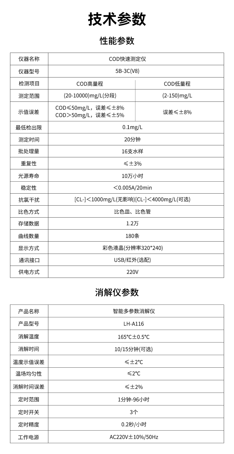 2、示值誤差:COD≤50mg/L,誤差≤±8%;COD>50mg/L,誤差≤±5%